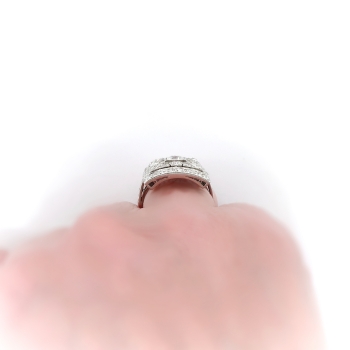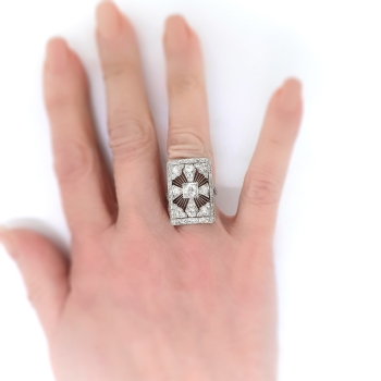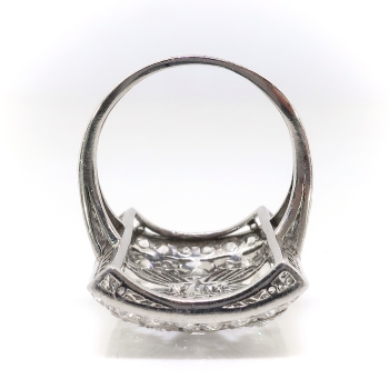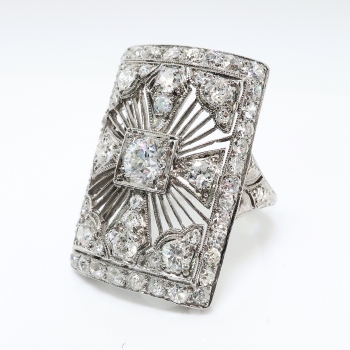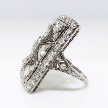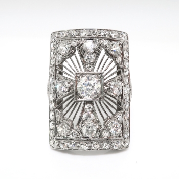 This is such a special Edwardian find!!! I not only love modeling it but just holding it and eyeing every detail transcends me into the romantic 1920's!!! Wear this as an alternate engagement ring or stunning right hand ring as a gift to yourself! This unique Edwardian jewel comprises a rectangular filigree mounting with a radiant shield filigree cross design measuring 25.22mm x 17.40mm, bead-set throughout with a total of 59 old European and single cut diamonds, on a graduated shank, the shoulders of which are each set with one diamond, which measures from 1.05mm to 6.68mm wide. The central diamond is old European cut, SI1 in clarity, H-I in color, measures approximately 4.85mm x 4.85mm x 3.15mm, and weighs approximately .47 carats. The 60 smaller diamonds are VS2-I1 in clarity, H-J in color, measure from approximately 1.53mm to 2.96mm in diameter, weigh from approximately .01cts to .10cts each, and have an approximate total accent carat weight of 2.18 carats. This outstanding ring overall has a grand total gem weight: 2.65 carats. The ring is unmarked, weighs a hefty 8.2 grams, and fits like a finger size 7.25 (6.75 on a mandrel). My trusted jeweler can safely re-size this up or down for a flat $75.00 platinum fee, just ask! I will be more than happy to email a current certified retail replacement appraisal upon completion of sale, just ask! Don't forget to view this ring's YouTube video to view every glistening angle! Questions are welcomed on Ring-2216.