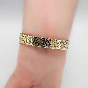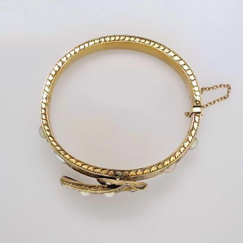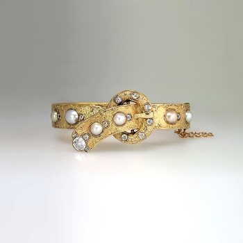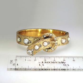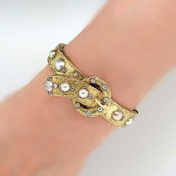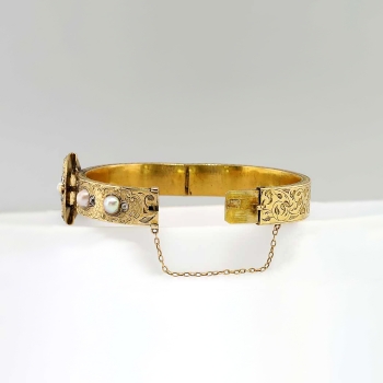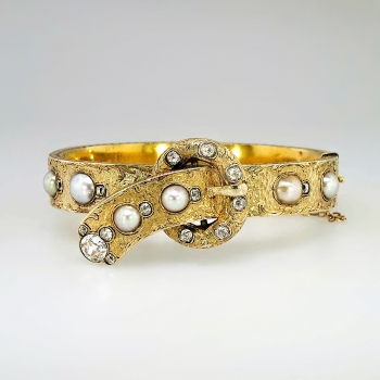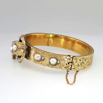 You just don't find these authentic Victorian era antique bracelets anymore. It's almost difficult not to add it to my collection. But this bracelet will be someone's dream piece, so here it is! An original US original antique cushion diamond and mabe' pearl filigree hinged bracelet with a soldiered safety chain with a era appropriate buckle design. This piece is in incredible condition for being over 130 years old! It fits up to a 7.25" inch wrist, and weighs 33.6 grams of solid 18k yellow gold. All the filigree is intact. All the pearls perfect and original. All the diamonds have matching quality and sparkle. AMAZING. A total of 15 antique cushion cut old mine cut diamonds with the quality range of H-K color, SI1-I1 clarity and a total carat weight of approximately 1.70ctw adorn this piece of art! Not to mention a big and gorgeous old mine cut diamond on the very end of the buckle like piece weighing approximately .80cts with comparable quality. A grand total carat weight of 2.5ctw! It also has those six gorgeous pearls with amazing luster and a soft coloring of pink, peach, purple, and beige. The pearls range from 6-9mm. The bracelet has filigree even on the outer edges! And it goes all the way around! This bracelet has the measurements of 21.35mm at it's widest point, the main bangle part being 10.39mm wide, and the thickness of this bracelet is 2.83mm. Don't forget the beautiful hand carved floral design underneath! If not in a museum, adorn your wrist. Questions are welcomed on Bracelet-794.