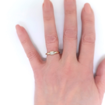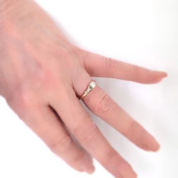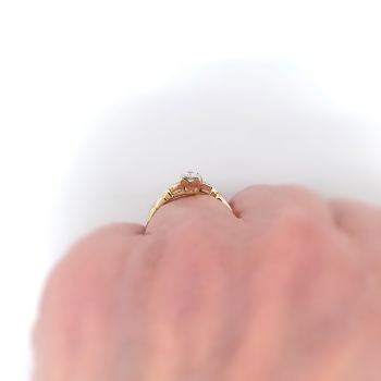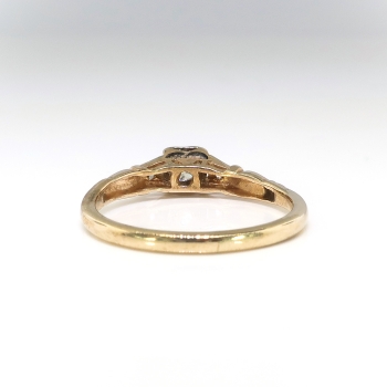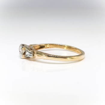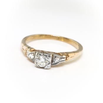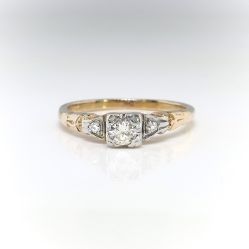 A charming, petite 14k yellow and white gold diamond engagement ring, of cast and assembled construction, circa mid-20th century is ready to delight! This two-tone gold ring features a round brilliant cut diamond set in a four-prong illusion mounting flanked by two single cut diamonds bead-set within millegrain-edged, geometric mountings, all in white gold, on the shoulders of the half-round, yellow gold, engraved shank, which measures from 1.63 to 2.11 mm in width. The center diamond is VS2 in clarity, H-I in color, cut grade: good, measures approximately 3.54 mm in diameter, and weighs approximately .16 carats. The two single cut diamonds are SI2 in clarity, H-I in color, measure approximately 1.53 mm in diameter, and weigh approximately .01 carats each. Approximate total gem weight: .18 carats. This ring is currently a size 5.75. The ring is unmarked. Total weight: 1.5 grams. The cost of additional sizing up or down will be determined on a case by case basis so please inquire :). Ring re-sizing takes an additional 1-5 business days. I will be more than happy to email this ring's current certified and guaranteed retail replacement appraisal upon completion of sale, just ask! Questions welcome on 2165-Ring.