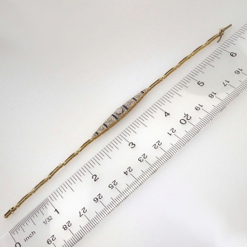 What a beautiful vintage bracelet to wear with ANYTHING! This bracelet has a platinum top and 18k yellow gold bottom, along with a box clasp with a safety catch for a secure piece from the 1920's! A two tone elegant bracelet with a pop of royal blue sapphires for a vintage adornment to go with any attire! This bracelet weighs 7.3 grams and measures 6.25" inches in length for the woman with the petite wrist. It is flexible and is in wonderful nearly antique condition! This bracelet is stamped with two crowns and 750. It has UK origin and was made sometime in the late Edwardian-early Art Deco era. This bracelet features 12 old European cut diamonds having an approximate grand total weight of approximately .21ct t.w.. Those diamonds have the quality range of H-K color, SI1-I1 clarity. There are also .22ct t.w. in natural calibre' cut blue sapphires for the perfect understated elegant piece! Questions are welcomed on this lovely find, Bracelet-1476.