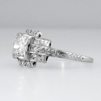 Fall in love with this ring! This ring just speaks romance! It is the perfect size, style, and sparkle for the vintage jewelry lover. This ring features a lovely .74ct transitional cut diamond with the quality grade of J color, VS2 clarity. It has subtle floral engraving on the platinum mounting with single cut diamonds adorning the central diamond (.12ctw). Those diamonds have comparable quality and highlight the center stone perfectly. The total carat weight in this ring is approximately. 86ctw. This ring sits nice and low on the finger, is made entirely in platinum, and is currently a size 6.5. This ring can easily be resized by a trusted jeweler. Layaway and questions are welcomed.
