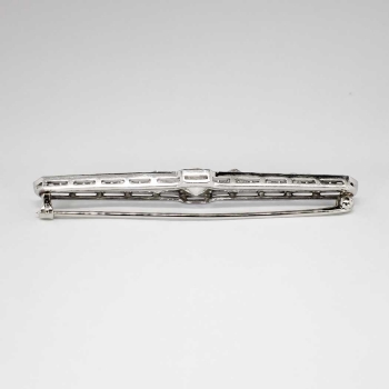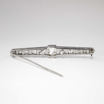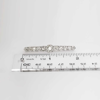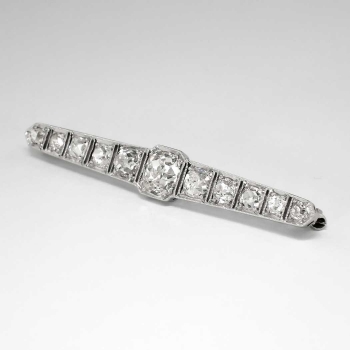 This jaw-dropping chunky old European cut and old mine cut diamond brooch from the early Edwardian era will look perfect placed on a blazer lapel, incorporated into your hair on your wedding day, or added to that dress for a special embellishment! This brooch features nine chunky old European cut and old mine cut diamonds, all safely set in a milgrain platinum mounting (pin that goes through part is 14k white gold). The diamonds have the quality range of H-I color, VS1-SI1 clarity. The central diamond weighs .75cts, followed by tapering old cut diamonds (two .35cts, two 20cts, two .15cts) for a grand total diamond weight of an extraordinary 2.15ct t.w.! This pin measures 2" inches in length, weighs 5.7 grams and is in pristine antique condition! A rare brooch worth over $8,000+ from any fine antique jeweler. Acquire it from Jewelry Finds for a steal! Questions are welcomed on Pin-1377.