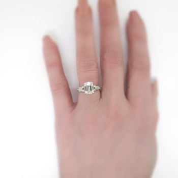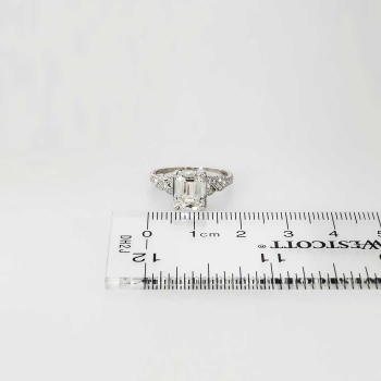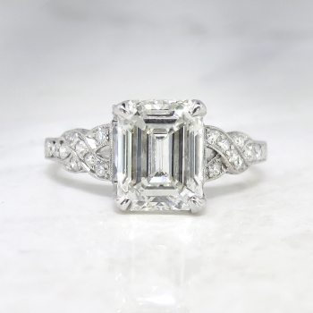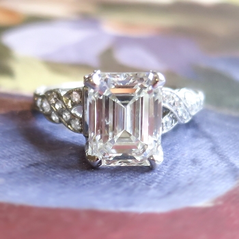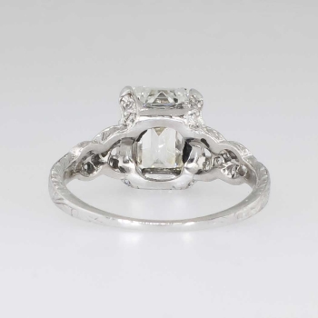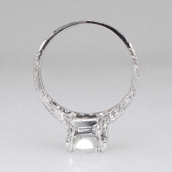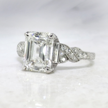 This extraordinary and rare heirloom diamond engagement ring from the swinging 30's will be the most unusual and gorgeous ring you have ever set your eyes on! I know for me, this ring is IT! It is very, very rare to find an authentic Art Deco engagement ring with an emerald cut diamond, especially an emerald cut diamond larger than 1 carat! So this glittering and fine 2.52ct I color, SI2 clarity diamond truly is a special find! Find similar authentic rings from other jewelers for almost double the price, but acquire it from me for a fraction of the price. I love helping people find their dream rings! The center stone has been certified by GIA (GIA # 6157416400) and the report will be mailed upon completion of sale. This ring is made entirely in platinum, and has these uniquely set spectacular straight baguette cut diamonds (.18ct t.w.) that surround the central diamond. The prongs are each bead-set with three round cut diamonds (a mix of single and round brilliant cut), with cross-over style shoulders surface-prong-set with eight single cut diamonds, on an engraved shank which measures from .88mm to 2.22mm wide. Basically diamonds and hand engraving at every angle! Those beautiful diamonds have the quality range of G-H color, VS1-SI1 clarity. A dream ring (MY dream ring in fact!) that has a grand total diamond weight of approximately 2.90ct t.w.! This ring is raised elegantly 8mm off the finger and is currently a finger size 6. My trusted jeweler can easily re-size this up three sizes or down two, just ask! I will be more than happy to type up a a replacement appraisal for insurance purposes upon completion of sale, just ask! Questions are welcomed on Ring-1296.