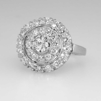 This vintage heavy platinum 'bulls eye' ring can either be a fabulous cocktail ring, or a sparkling engagement ring! The diamonds are all a well matched G-I in color, VS1-SI1 in clarity. It is made in the era appropriate style of double halo with a six pronged 1/4ct central diamond. The first larger halo has 16 .055 diamonds for total weight of .88ctw. Next is the smaller halo of diamonds, consisting of 12 .03ct diamonds with a total carat weight of .36ctw. And finally, the central diamond weighs .26cts and is graded a G color, VS2 clarity round brilliant cut diamond. This ring has a grand total carat weight of 1.50ctw exactly. This ring is made in 10 parts iridium, 90 parts platinum (900 pt). That was the standard mix of platinum metal in the 1950's. This ring has a diameter of 16mm (about the size of a dime!) and has an open undercarriage. The shank is 2.44mm wide, and the ring is currently a size 5. It can easily be resized by a trusted jeweler. This ring is raised 6.3mm off the finger, and the ring weighs an impressive 7 grams. What a fantastic vintage blinding ring! Layaway and questions are welcomed (Ring-802).
