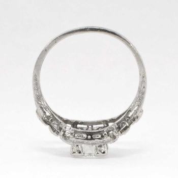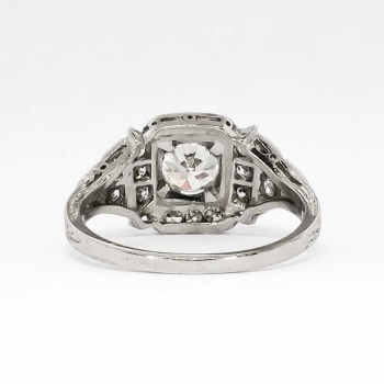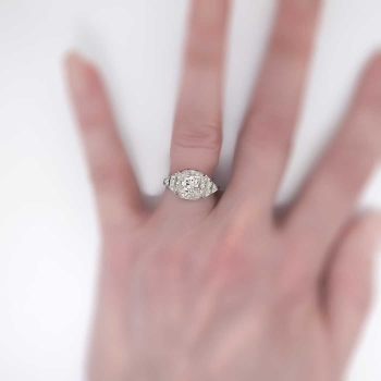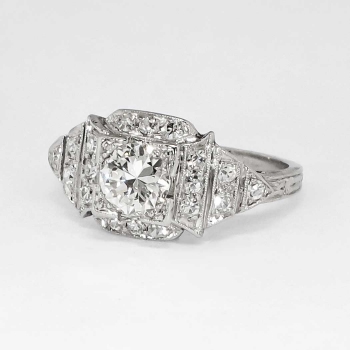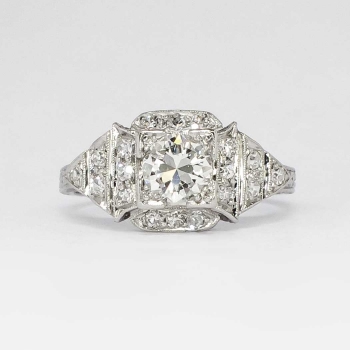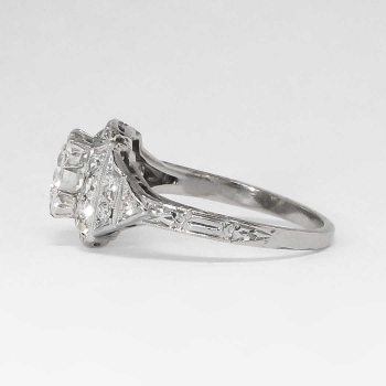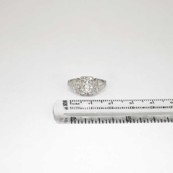 No you are not dreaming. This ring is the real deal, an authentic 1930's diamond and platinum engagement ring in pristine condition in a great price point. Make all your friends and family jealous with this heirloom bauble that glitters across a football field! This ring features a central transitional old European cut diamond weighing approximately .67cts with the quality grade of J color, VS1 clarity. That diamond is safely box set with 18 bead set single cut adorning diamonds having the quality range of G-H color, Si1 clarity, and a grand total accent weight being .36ct t.w.. Crisp milgrain work and elaborate hand engraving really makes this ring pop, with an unusual style of it's own! This ring measures 10mm North to South, 18.73mm East to West, and is raised 5.25mm off the finger. This ring weighs 4.3 grams, is made entirely in platinum, is currently a finger size 6, and my trusted jeweler can safely re-size this up or down three sizes, just ask! I will be more than happy to type up an insurance replacement appraisal upon completion of sale, just ask! Questions are welcomed on Ring-1403.