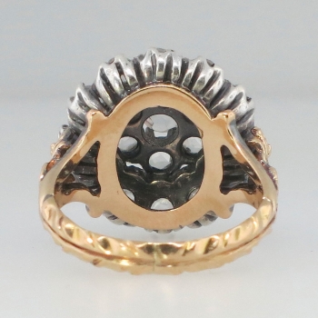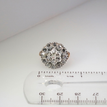 This very unique 18K and sterling silver ring is inspired from the Georgian era and is truly stunning!  This ring has a gorgeous patina added to the rose and yellow gold with sterling silver top. This ring features18 unbelievable rose cut diamonds of a wonderful quality (G-H/SI1-SI2 clarity). They have an estimated total carat weight of approximately 1ctw! The true beauty of this ring is the stunning metal work in the gold highlighting the diamonds. The top width of this magnificent ring measures 16.8mm (outside prong tips across) and tapers down to 2.92mm. This ring is currently a size 6 and can easily be resized by a trusted jeweler. Layaway and questions are welcomed on this fascinting ring.