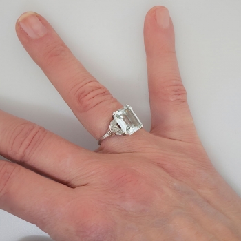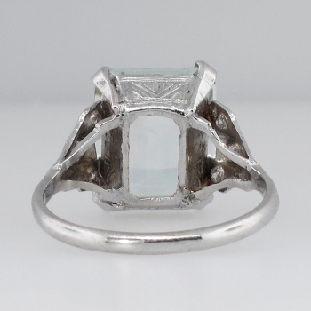 Understated elegance is all I can say about this ring! This would make an unusual engagement ring for someone who loves a crystal clear watery colored aquamarine with clean lines. The stone measures roughly 12mm x 10mm x 6mm deep which is estimated to be around 5 carats. It is held in an etched basket with milgrain set, diamond shoulders (.06ctw). The watery dreamy aquamarine is a very pale green / blue. This ring is currently a size 7 and was recently refurbished and is in excellent vintage condition. This ring dates back from the Art Deco era and is a timeless piece to own. A clean, pretty ring! Layaway and questions are welcomed.