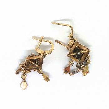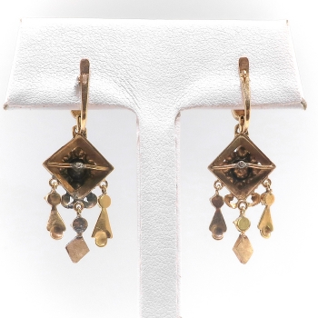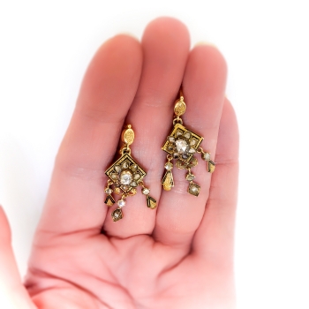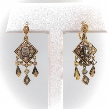 This precious pair of true Victorian twinkling yet understated rose cut diamond danglers are a perfect addition to any outfit; dressed up or down! They can be worn with anything from jeans to a black dress. These are a sweet pair of 14k and 18k yellow gold and diamond earrings, of hand-made construction, circa late-19th century with later earring findings. Each earring measures 1 ¼” long and comprises an 18k hinged lever-back mounting with oval plaque and round rose cut diamond from which is suspended a 14k diamond-shaped mounting set with oval and triangular rose cut diamonds, from which are suspended three drops set with rose cut diamonds. The mountings are set with black basse-taille enamel. The twenty-six diamonds are SI1-SI2 in clarity, L-N in color, measure from approximately 1.50 x 1.50 mm to 4.40 x 3.75 mm, weigh from approximately .01 to .10 carats each, and have an approximate total weight of .66 carats. The earrings are unmarked. Total weight: 5.4 grams. Don't let these one of a kind earrings get away! These authentic Victorian era earrings are being sold as is (if you would like regular posts and new backs put on please inquire for the price and I will get a quote from my jeweler, not a problem!). Questions are welcomed on Earrings-2347.