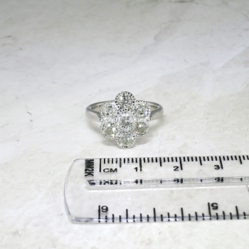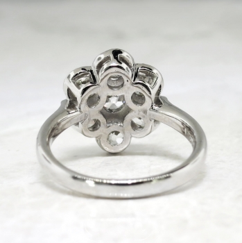 This bold and glittering cocktail ring is a mix of something old and something new! This vintage (Circa 1990's) handmade platinum statement ring has 1.33ct t.w. of chunky old mine cut diamonds with milgrain bezel accents in a flower motif. This ring can be worn as an alternate engagement ring, unique anniversary ring, or for any occasion! The diamonds are graded H-K color, SI1-I1 clarity, and have unbelievable brilliance (hard to convey with the photographs). Each diamond was hand cut over 100 years ago and mismatched for a gorgeous artistic flair. The central diamond weighs approximately .46cts, and the six surrounding diamonds have a combined carat weight of approximately .85ct t.w.. This ring has a grand total diamond weight of 1.33ct t.w.. This ring weighs a solid 8 grams and is currently a finger size 6.75. My trusted jeweler can safely re-size this up to four sizes or down to two sizes free of charge, just ask! I can email a retail replacement insurance appraisal upon completion of sale, just ask! Questions are welcomed on Ring-1533.