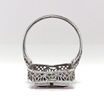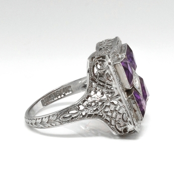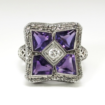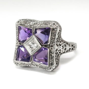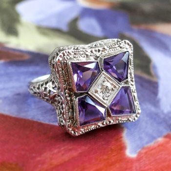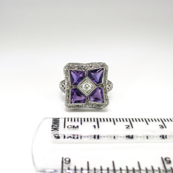 This magical Art Deco amethyst and diamond cocktail ring is in pristine condition and has the most vibrant amethysts surrounding a single twinkling diamond surrounded by crisp filigree work. Don't miss out on this one! The designer 'Belais' was a HUGE influence on Art Deco jewelry designs and this jewelry house's pieces are highly collectible. The four fancy cut shield amethysts are natural and weigh approximately .50cts each (2ct t.w.). Those gemstones are surrounding a .10ct H color, SI1 clarity diamond. This ring has a grand total gemstone and diamond weight being 2ct t.w.. This ring is a wonderfully gracious size, measuring 15.25mm North to South, 14.78mm East to West, and is raised regally 7mm off the finger. This ring is stamped 'BELAIS 14k', is made entirely in 14k white gold, and weighs 3.5 grams. This ring is currently a finger size 6.5 and my trusted jeweler can safely re-size this up or down to two sizes free of charge, just ask (additional sizes up are a flat $45.00 gold fee, just ask!). I will be more than happy to email a current certified retail replacement appraisal upon completion of sale, just ask! Don't miss out on this one of a kind ring and message me to start your layaway TODAY! Don't forget to view this ring's YouTube video to view every glistening angle! Questions are welcomed on Ring-1737.