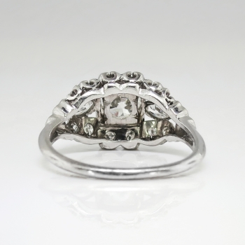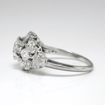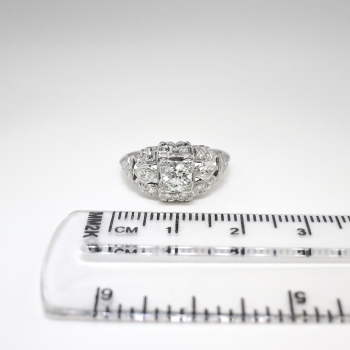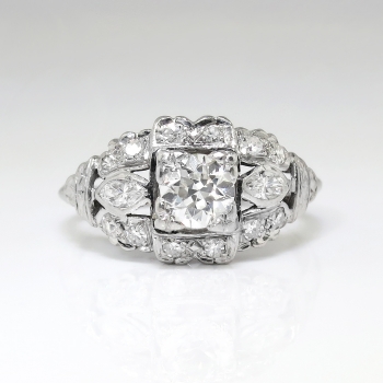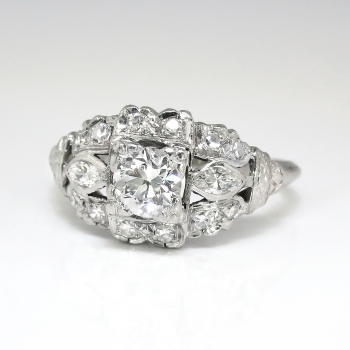 This is a blinding 1940's glitter bomb at an affordable value, only from Jewelry Finds! This ring has every element you would want in a vintage platinum and diamond engagement/anniversary ring. This ring features an approximate .47ct central old European cut diamond having the quality grade of J color, VS2 clarity. That glorious diamond is set in an ornate early 1940's multi-shaped diamond setting in platinum. That mounting is set with two .09ct bezel set marquise diamonds (G color, VS1-VS2 clarity), and 12 .01ct bead set single cut diamonds ( .12ct t.w., G-H color, SI1-SI2 clarity). This ring has a grand total diamond weight of approximately .77ct t.w. The ring measures 10.15mm North to South, 18mm East to West, and is raised 5.5mm off the finger. This ring is stamped '900 PLAT. 100 IRID.', weighs 3.8 grams, and is currently a finger size 5.5. My trusted jeweler can safely re-size this up or down two sizes free of charge, just ask (additional sizes up are a flat $75.00 platinum fee, just ask!). I will be more than happy to email a certified retail insurance replacement appraisal upon completion of sale, just ask! I also have an independent unbiased appraisal in the amount of $3600.00! Layaway and questions are welcomed on Ring-1663.