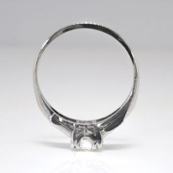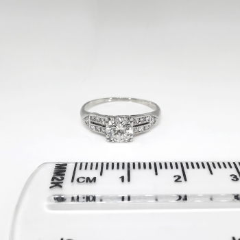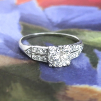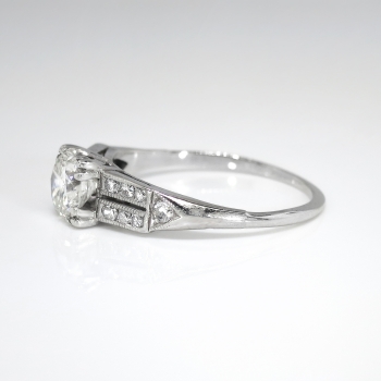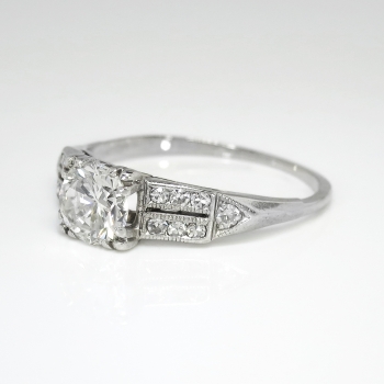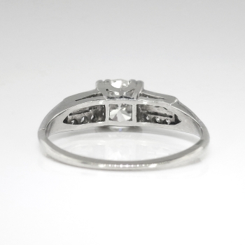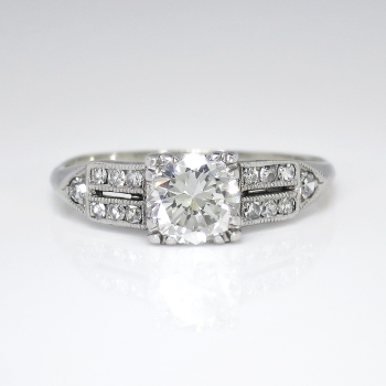 This glittering beauty from the late Art Deco- early Retro era has that beautiful execution and a timeless style. A style only the 1940's could create perfectly! A ring with crisp milgrain edging and tiny channel set diamonds on either side of the shank that come to a point. A beautiful central .70ct old transitional cut diamond is safely triple claw prong set in platinum and is graded I color, VS2 clarity. That beautiful diamond is adorned by two double channel set rows of 14 single cut diamonds (.16ct t.w.) that have the quality range of H-I color, SI1-I1 clarity. A truly timeless engagement ring! This ring has a grand total carat weight of approximately .86ct t.w. but appears much larger! This ring has a platinum top and 14k white gold band (shank). My jeweler can re-shank this in platinum for a flat $200.00 fee in any size, just ask! This ring measures 5.55mm North to South, 17mm East to West, and is raised 5.23mm off the finger. This ring weighs 2.7 grams, is currently a finger size 6.25, and my trusted jeweler can safely re-size this up or down two sizes free of charge, just ask (additional sizes up in 14k white gold will be a flat $45.00 fee, just ask!. I will be more than happy to type up a certified retail insurance replacement appraisal upon completion of sale, just ask! Questions are welcomed on Ring-1638.