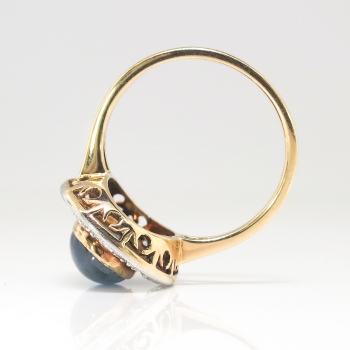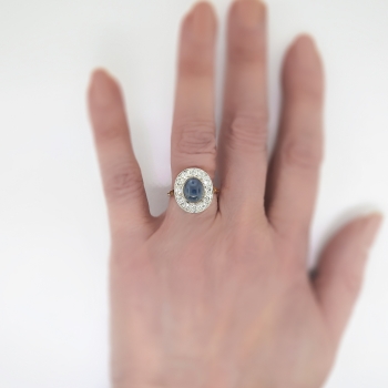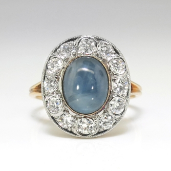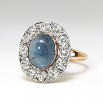 What a beauty! Not all star sapphires need to have a radiating star, some have secret subtle ones only shown in certain lighting with a mystic grayish mauve glow. I love this ring and it will go with just about anything! This ring is made in 14k yellow gold and platinum (tested and guaranteed), featuring a cabochon natural star sapphire corundum. The ring comprises a platinum-topped, millegrain-edged oval mounting measuring 16.36mm x 14.13mm, bezel-set at the center with an oval cabochon cut star sapphire, surrounded by 12 old European cut diamonds, alternately bead- and bezel-set, on a yellow gold, split shank which measures from 1.25mm to 3.7mm wide. The star sapphire measures approximately 9.16mm x 7.05mm x 4.58mm, and weighs approximately 3.08 carats. The adorning twinkling diamonds are VS1-VS2 in clarity, G-H in color, measure an approximate average of 2.65mm in diameter, and weigh approximately .07cts each. This ring has a grand total gemstone and diamond weight of approximately 3.92ct t.w.. This ring weighs 4 grams, measures 6.5mm off the finger, and is currently a finger size 6.25. My trusted jeweler can safely re-size this up or down two sizes free of charge and will take an additional 1-5 business days, just ask (additional sizes up will be an additional fee, please inquire). Questions are welcomed on Ring-1831.