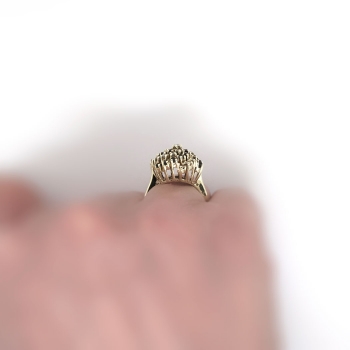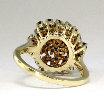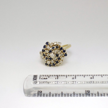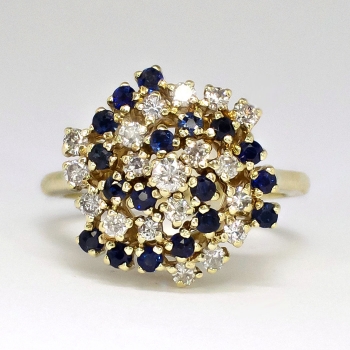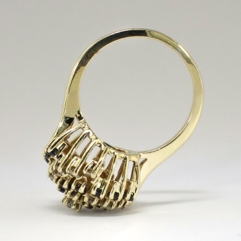 This affordable and impressive trinket from the 1970's features a spiral design of twinkling diamonds and navy blue natural sapphires set entirely in solid 14k yellow gold. This ring has a central .05ct round brilliant cut diamond with the quality grade of J color, I1 clarity. Surrounding the central prong set diamond are spirals of 18 round brilliant cut diamonds (.02cts-.03cts each, I-J color, SI2-I1 clarity) and a combined diamond accent weight being .45ct t.w.. In addition to this diamonds, there are 18 natural navy blueberry blue round cut sapphires weighing approximately .04cts each, for a grand gemstone weight being .72ct t.w.. A grand diamond and gemstone weight being 1.22ct t.w.. This ring measures 16.5mm in diameter and is raised regally off the finger 12mm. This ring weighs 6.3 grams (nice and solid!), is currently a finger size 6.5, and my trusted jeweler can safely re-size this up four sizes or down two sizes, just ask. Questions are welcomed on Ring-1468.