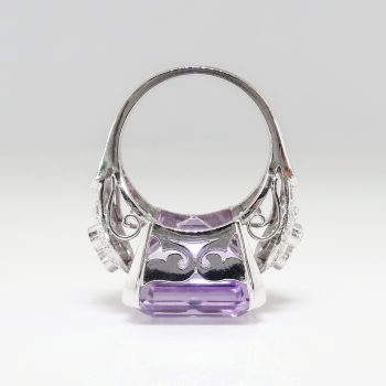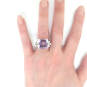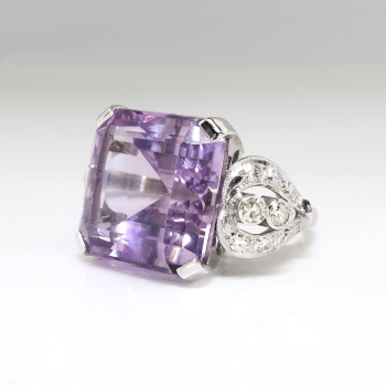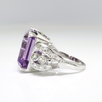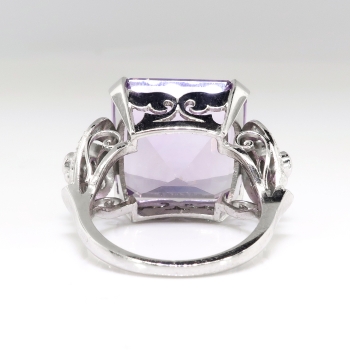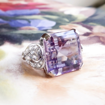 A true 1940's elegant piece of art for you! A rare and stunning 'Rose De France' hued natural step cut square emerald amethyst with diamond adorned swirls and sparkle and a unique style! A vintage and elaborate ring such as this one is a rare find indeed! This ring features an approximate 12ct step cut square emerald cut 'Rose De France' amethyst set in a four-prong basket mounting, with an open scrollwork gallery, on a half-round shank which measures 1.50mm to 2.36mm in width, with open, bowed shoulders. In addition to that sparkling lavender gemstone (the birthstone for February!) are eight single cut diamonds, atop scrollwork galleries. The amethyst is eye clean, measures approximately 14.69mm x 14.71mm x 10.38mm, and weighs approximately 12.00 carats. The diamonds have the quality grade range of G-H color, SI1-SI2 in clarity, and weigh from approximately .02cts to .05cts each, and have an approximate diamond accent weight of .44cts. This enormous cocktail or unique engagement ring has a grand total gemstone and diamond weight being 12.44ct t.w.. This ring measures a whopping 14.7mm North to South, 14.75mm East to West, and is raised 13mm off the finger. This ring has been entirely tested and guaranteed to be luxurious platinum, weighs 9.4 grams, and is currently a finger size 5.5. Approximate total gem weight: 12.44 carats. The ring is unmarked. Total weight: 9.8 grams. Jewelry Finds® additional sizing up or down will be determined on a case by case basis so please inquire :). Ring re-sizing takes an additional 3-7 business days by a third party Master Bench Jeweler, not to worry! Your ring is in good hands! I will be more than happy to email this piece's current certified and guaranteed retail replacement appraisal upon completion of sale, just ask! Questions are welcomed on Ring-2042.
