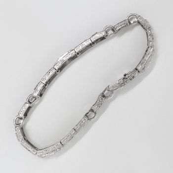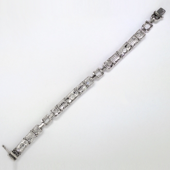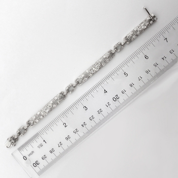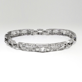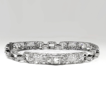 Who wouldn't want this amazing one of a kind, hard to find bracelet hand crafted with a ton of mixed antique cut diamonds from the 1920's! To find a bracelet with mixed cut diamonds with such sparkle and detail work from this era is very rare! The accumulative diamond weight is an impressive 5.22ct t.w. and if you can pull it off, wear it everyday with jeans if you want! This bracelet measures 7.5" inches in length, 7.88mm wide, 4mm thick, and has a great hidden 18k white gold fold over safety clasp for safe keeping. This heirloom piece has been triple checked, polished, and looked over by my skilled bench jeweler and an independent graduate gemologist appraiser and is in excellent nearly antique condition! The central larger cushion-oval old European cut diamond weighs approximately .81cts and has the quality grade of J-K color, VS1 clarity. The two additional larger old European cut diamonds each weigh .42cts and .47cts, and have the quality grade range of H-I color, SI1-SI2 clarity. In additional, there are two unique and rare antique trilliant cut diamonds that have the quality grade range of G-H color, VS1-SI1 clarity. To finish off this gorgeous piece are 30 old European cut and single cut diamonds that have the quality grade range of G-H color, VS1-SI1 clarity, and a grand total diamond weight being 2.68ct t.w.. This magnificent bracelet has a grand total diamond carat weight of approximately 5.22ct t.w.. The great thing about this bracelet is that they catch so much light and the diamonds look whiter and brighter in the sunlight! Filigree segments with glittering diamonds making this bracelet difficult to pass up, especially at this price! It is much lovelier in person! This bracelet weighs 22.7 grams, is made entirely in platinum with an 18k white gold clasp (stamped and guaranteed), and will be a beautiful addition to your Edwardian jewelry collection.I will be more than happy to email this piece's current certified and guaranteed retail replacement appraisal upon completion of sale, just ask! More images are available just ask! Questions are welcomed on Bracelet-1751.