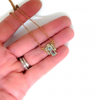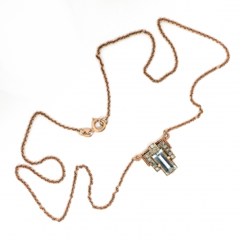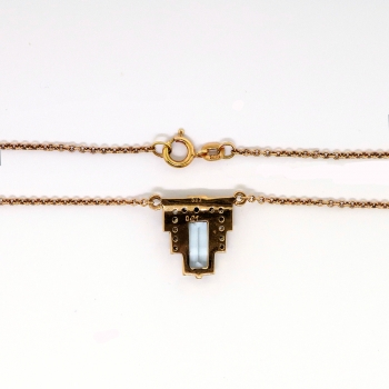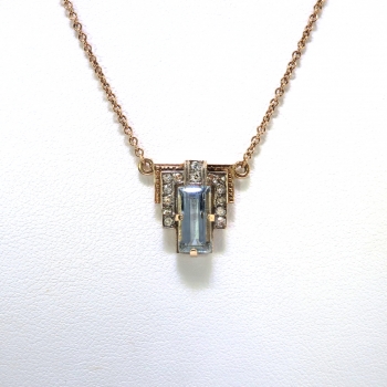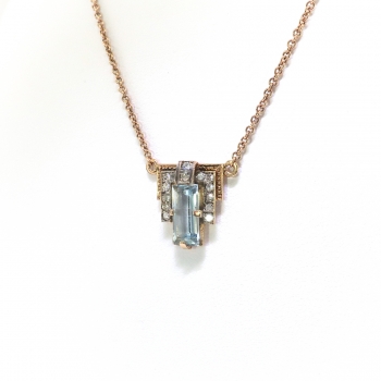 Pictures don't do this aquamarine and old diamond late Art Deco Circa 1940's pendant justice! This is a lovely and versatile early necklace that can be worn day to night! Or even better, it's 'Something Old, Something New, Something Blue' for your wedding! I almost want to keep this one! But it will be someone's perfect wedding pendant or graduation gift! I can't keep everything! 14k yellow-rose (in between hues) gold, natural aquamarine beryl, and diamond necklace, of hand-made construction. The necklace measures 17” long and comprises a central geometric pendant measuring 14.81 x 12.23 x 3.15 mm, prong-set with one baguette cut aquamarine and bead-set with 14 single cut diamonds set in white gold, fixed between two lengths of 1.45 mm wide cable chain, terminating in a spring ring clasp. The aquamarine measures approximately 10.32 x 4.98 x 3.13 mm, and weighs approximately 1.18 carats. The twinkling antique cut accent diamonds are SI1-I1 in clarity, H-I in color, measure an approximate average of 1.80 mm in diameter, and weigh approximately 0.02 carats each. Approximate total gem weight: 1.46 carats. The necklace is stamped “585 0.21.” Total weight: 4.2 grams. Questions are welcomed on Pendant-2475.