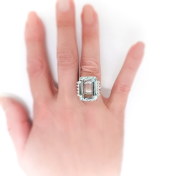 This huge and affordable sky blue aquamarine & diamond ring will be the perfect adornment for your right hand on your wedding day, as an alternative engagement ring, or if you are a March baby like I am! I would recommend double checking the measurements with a ruler on your hand to make sure it won't be too big (as if there is such thing...!) This sensational ring is solid 14k white gold, featuring an enormous and clear emerald cut aquamarine, with the perfect amount of round brilliant cut diamond accents, set in a four-prong basket mounting flanked by 10 round brilliant cut diamonds vertically set at the sides of the aquamarine, on a half-round shank which measures from 1.89mm to 2.61mm wide. The emerald cut aquamarine measures approximately 20.07mm x 14.96mm x 8.25mm, and weighs approximately 14.15 carats. The adorning diamonds are SI2 in clarity, F-G in color, cut grade: good, measures approximately 2.44mm in diameter, and weigh approximately .05 carats each. This 'Meghan Markle' style cocktail ring has a grand total gem weight: 14.65 carats. The ring is stamped “14K", weighs a hefty 9.9 grams, and is currently a finger size 6.5. Feel free to check out and just shoot me an email with the finger size you need! Jewelry Finds® ring re-sizing takes an additional 3-7 business days by a third party Master Bench Jeweler, not to worry! Your ring is in good hands! I will be more than happy to email this piece's current certified and guaranteed retail replacement appraisal upon completion of sale, just ask! Don't let this piece get away! Questions are welcomed on Ring-2228.