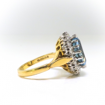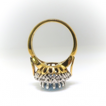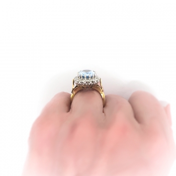 Move over, Meghan Markle ring! This vintage yet classic fine quality aquamarine and diamond halo ring is so striking you will want to wear this with everything from jeans to an evening gown! A sensational oval cut highly desirable Brazilian natural aquamarine weighing approximately 3.93cts set with a white gold prong set halo of 16 round brilliant cut diamonds with the quality grade range of G-I color, SI1 clarity, for a grand total diamond weight of approximately .64ct t.w.. This ring has a grand total gem weight of approximately 4.57ct t.w.. This beautiful design is set atop a solid 18K yellow gold shank with 18k white gold top. This ring is stamped: "crown" 750, "leopard's head", B maker's marks: AJW which means it is made entirely in solid 18K two tone gold and was assayed in London in 1976. The ring overall measures 18mm North to South, 17mm East to West, and the shank measures 3mm wide. I almost kept this one! It has the best of EVERYTHING! This ring weighs a heavy and luxurious 7.2 grams and is currently a finger size 6.25. I can have my trusted jeweler safely re-size this ring for a $45 gold sizing fee ($90 if more than three sizes up) and will take 3-7 business days to size. If you would like sizing, just message me prior to checking out and I'll adjust the listing promptly. I can also type up a certified current retail replacement appraisal in your name as soon as you let me know you've received the piece, just ask! Questions are welcomed on Ring-2544.