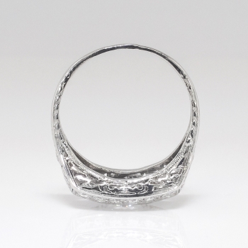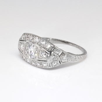 This is such a transcendent and glittering multi-diamond ring from the 1930's- a true beauty! It is hand crafted entirely in platinum and has an incredible presence! Don't miss the filigree undercarriage that sits nice and low on the finger. This ring features a central old European cut diamond weighing approximately .43cts, with 22 adorning single and old transitional cut diamonds each weighing .03cts-.05cts each for a grand total accent carat weight of approximately .88ct t.w.. The diamonds are graded I color, SI1 clarity, and have an even shine and color dispersion! It's just the perfect twinkling Art Deco diamond ring! This ring has a grand total diamond weight of approximately 1.31ct t.w..This ring measures 9.5mm North to South, 17.42mm East to West, and is raised 4mm off the finger for a smooth low profile impressive ring! This ring is made in platinum (stamped 'PLAT'), weighs 4.9 grams, and is currently a finger size 6.5 and is resizable. Contact us for pricing. Ring re-sizing takes an additional 1-5 business days. I will be more than happy to email this ring's current retail replacement appraisal upon completion of sale, just ask! Questions are welcomed on Ring-1622.