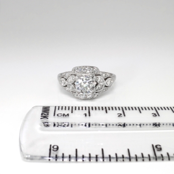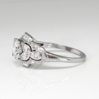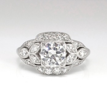 This authentic 1930's beauty has elegant execution and an array of glittering mixed cut diamonds with a bold and impressive design. So beautiful! This ring features a central .80ct old transitional cut diamond that has the quality grade of I color, VS1 clarity, and is securely box set. That diamond is surrounded by 12 single cut bead set diamonds weighing .01cts to .03cts each, and six .06ct bezel set marquise diamonds. All the accent diamonds are graded I color, VS1-VS2 clarity. This ring has a grand total carat weight of approximately 1.36ct t.w.. This ring measures 10.85mm North to South, 18mm East to West, and is raised 5.5mm off the finger. This ring is made entirely in platinum (tested and guaranteed), weighs 5.1 grams, and is currently a finger size 8. My trusted jeweler can safely re-size this up or down two sizes free of charge, just ask (additional sizes up will be a flat $75.00 platinum fee, just ask!). I will be more than happy to email an independent certified and guaranteed retail replacement appraisal in the amount of $7700.00 upon completion of sale, just ask! Questions are welcomed on Ring-1717.