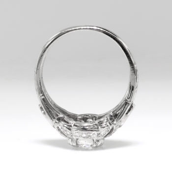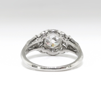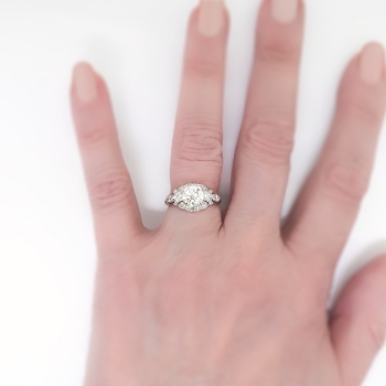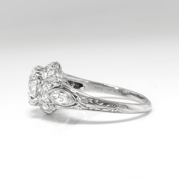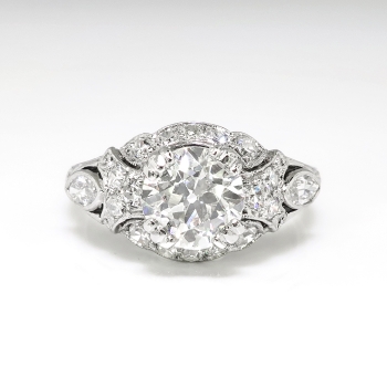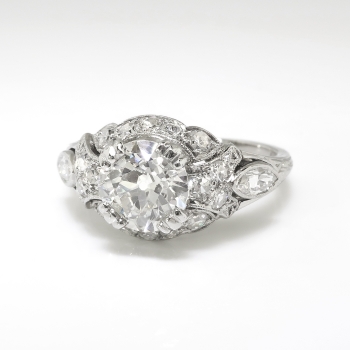 This authentic 'Kobrin Bros' US originated (NY) Art Deco engagement ring is an absolute Goldilocks Ring! You will be able to match it with anything, it's the perfect size, style, and has that wow factor at an affordable price! This ring brings the best of everything right on your finger- let it transport you back almost 100 years! This ring comprises a filigree dome mounting measuring 17.40mm x 9.22mm x 5.04mm in width, prong-set at the center with one Old European cut diamond, bead-set throughout with sixteen single cut diamonds, and bezel-set with two marquise cut diamonds, on a half-round shank which measures from 1.30mm to 1.90mm in width. The center diamond has the quality grade of I-J color, SI2 clarity and is eye clean and dazzling! The diamond measures approximately 6.58 – 6.60 x 4.00 mm, and weighs approximately 1.16 carats. The two twinkling era appropriate marquise cut diamonds have the quality grade range of H-I color, SI1 in clarity, measure approximately 4.73mm x 2.30mm, and weigh approximately .09cts each. And don't forget the additional single cut diamonds are VS1-VS2 in clarity, G-I in color, measure from approximately 1.70 to 2.00 mm in diameter, weigh from approximately .02cts to .03cts each, and have an approximate total weight of .36ct t.w.. This ring has an approximate grand total diamond weight being 1.70ct t.w.. The ring is stamped “10% IRID PLAT KOBRIN BROS”, weighs 3.73 grams, and is currently a finger size 5.25. Jewelry Finds® offers complimentary ring re-sizing + or - 2 sizes! The cost of additional sizing up or down will be determined on a case by case basis so please inquire :). Ring re-sizing takes an additional 1-5 business days. I will be more than happy to email this ring's current certified and guaranteed retail replacement appraisal upon completion of sale, just ask! This is a truly rare find, and no one will have this ring! It is a piece of art, an heirloom, and someone's dream ring! Questions are welcomed on Ring-2054.
