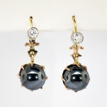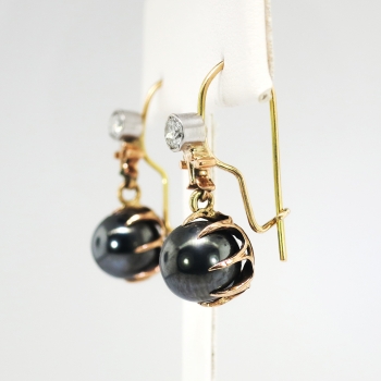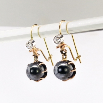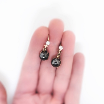 I just had to acquire these blackened silvery orbs of light and diamond adorned drop earrings from the 1930's! They will also wear better than pearls and are a great conversation pair of Art Deco earrings! The natural hematite ( extremely era appropriate) balls measure 9mm and weigh 6.5cts each approximately. Those gunmetal gems have the perfect amount of added sparkle! Those old European cut diamonds are graded I-J color, SI2 clarity, and have a combined carat weight of approximately .40ct t.w.. The diamonds are safely bezel set in platinum and the rest of the mountings being 14k rose-yellow gold. These earrings have a grand total gemstone and diamond weight of 13.40ct t.w. and measure 1" inch in length and 1/3" inch wide. These earrings are for pierced ears only and weigh a combined gram weight of 6.4 grams. These earrings are really unique so don't miss out! Layaway and questions are welcomed on Earrings-1610.
