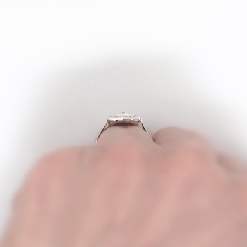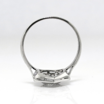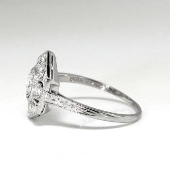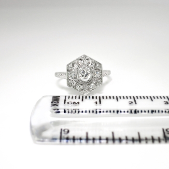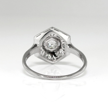 This glittering beauty from the swinging 30's has beautiful execution and a wearable design (perfect for the woman on the go!). This ring has subtle beading and bead/bezel set diamonds in a hexagonal Art Deco era appropriate design. This ring features a glittering central .17ct old European cut diamond safely set in a platinum bead set single cut diamond dazzled platinum mounting with with an impressive look and affordable price tag, only from Jewelry Finds! That diamond is surrounded by six .02ct single cut bead set diamonds with comparable quality and an accent total carat weight of .12ct t.w.. All the diamonds have the quality grade range of G-H color, VS1 clarity. This ring has a grand total carat weight of approximately .29ct t.w. but appears much larger! This ring is stamped 'BIRKS PLAT' and is made entirely in platinum. This ring measures 12.32mm North to South, 11mm East to West, and is raised 2.75mm off the finger. This ring weighs 3 grams, is currently a finger size 5.5 and my trusted jeweler can safely re-size this up or down to two sizes free of charge, just ask (additional sizes up will be a flat $75.00 platinum fee). I will be more than happy to email a certified and guaranteed retail replacement appraisal upon completion of sale, just ask! are welcomed on Ring-1680.