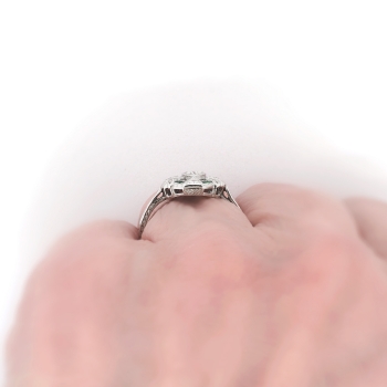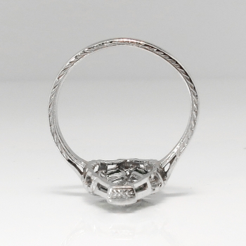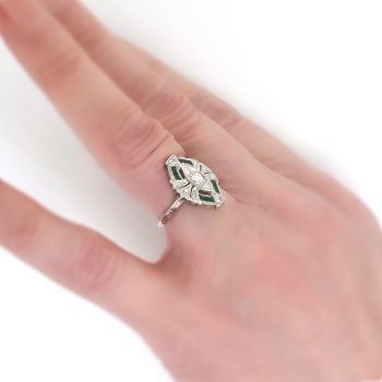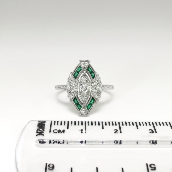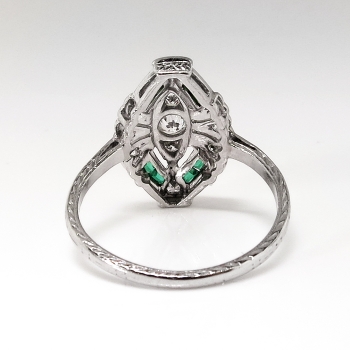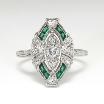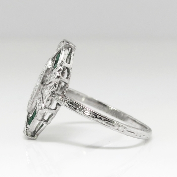 Don't miss out on this rare and beautiful 1930's era cocktail ring or alternate engagement ring! It has crisp hand engraving, natural emerald calibre' cut accent stones, and twinkling old single cut diamonds! It's such a special ring and a unique shape! This ring is bead-set with 10 single cut diamonds and eight natural rich green emeralds, atop a scrollwork gallery, on a flat, engraved shank. It rests subtly off the finger only 4mm tall and can be worn on any finger for any occasion! The diamonds have the quality grade range of H color, VS1-VS2 clarity, weigh .02cts each, and have a grand total carat weight being .20ct t.w.. The cut to fit emeralds weigh approximately .01cts each and have a grand total carat weight of approximately .08ct t.w.. This ring has a grand total gem and diamond carat weight of approximately .35ct t.w. This ring measures 16.80mm North to South, 111.5mm East to West, and is raised 3.5mm off the finger. The ring is stamped “10% IRID” and is tested and guaranteed platinum. This ring weighs 3.5 grams, is currently a finger size 5.75 and my trusted jeweler can safely re-size this up or down two sizes free of charge and will take 1-5 business days, just ask (additional sizes up will be a flat $75.00 platinum fee, just ask!). I will be more than happy to email a certified retail replacement appraisal, just let me know you’d like one when you receive it! Questions are welcomed on Ring-1781.