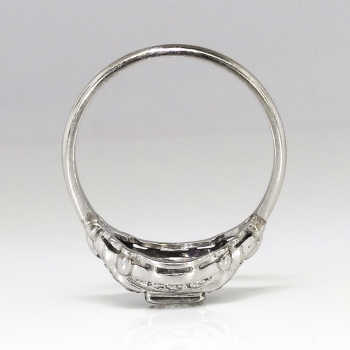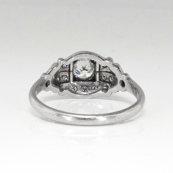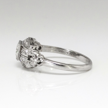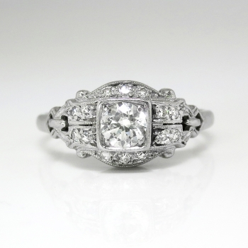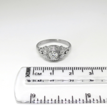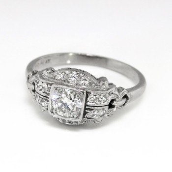 This clean and glittering platinum and diamond engagement ring hails from the early 1930's and would make the perfect engagement ring, right hand ring or anniversary ring! An original Art Deco engagement ring with a unique buckle diamond encrusted design all set in luxurious platinum! The central old transitional-European cut diamond weighs approximately .38cts and has the quality grade of I color, VS2 clarity. That diamond is surrounded by 14 .01ct old single cut diamonds that are bead set with the quality grade of I color, VS1-VS2 clarity. This ring has an approximate grand total carat weight of .52ct t.w. and would make any lady feel incredible honored to be given this token from the 1930's. This ring has subtle milgrain work throughout and is in excellent nearly antique condition! This ring measures 9mm North to South, 16.5mm East to West, and is raised 4.75mm off the finger. This ring is made entirely in platinum (stamped 10% IRID PLAT.), weighs 3.7 grams, is currently a finger size 7.5. My trusted jeweler can safely re-size this up or down 2 sizes free of charge and will take 1-5 business days, just ask (additional sizes up will be a flat $75.00 platinum fee, just ask!). I will be more than happy to type up a certified retail replacement insurance appraisal upon completion of sale, just ask! Questions are welcomed on Ring-1741.