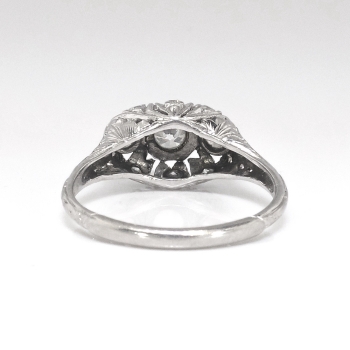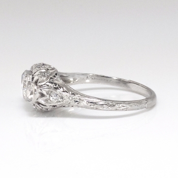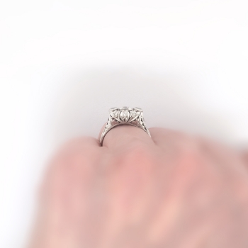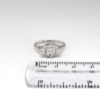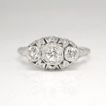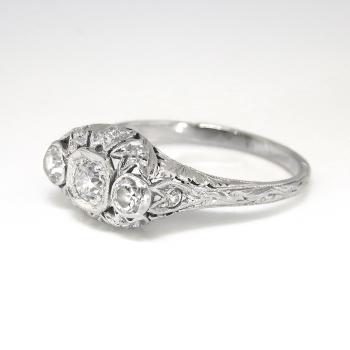 A fantastic Art Deco find! Big chunky, glittering old European cut diamonds in a platinum floral filigree mounting for the true vintage jewelry lover! I just love the presence this ring has! You can't miss this beauty! The central diamond weighs approximately .15cts, with the adorning two diamonds each weighing .18cts. The three central diamonds have the quality range of I-J color, VS2 clarity. The eight tiny transitional cut accent diamonds are graded I-J color, VS2-SI1 clarity and have a combined diamond weight of .08ct t.w. for that dazzling additional sparkle! This ring has a grand total carat weight being .59ct t.w.. The ring overall measures 8.5mm North to South and 13.4mm East to West, and is raised 6.3mm off the finger. This ring is stamped 'PLATINUM', weighs 3.6 grams, and is currently a finger size 7.25. My trusted jeweler can safely re-size this up or down two sizes free of charge, just ask (additional sizes up are a flat $75.00 platinum fee, just ask!). A certified retail replacement appraisal can be emailed upon completion of sale, just ask! This would make a jaw-dropping engagement ring or anniversary ring! Questions are welcomed on Ring-1624.