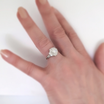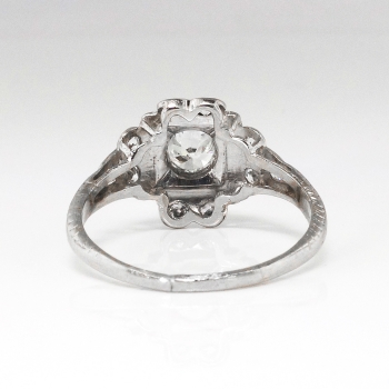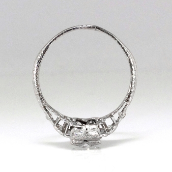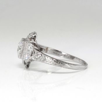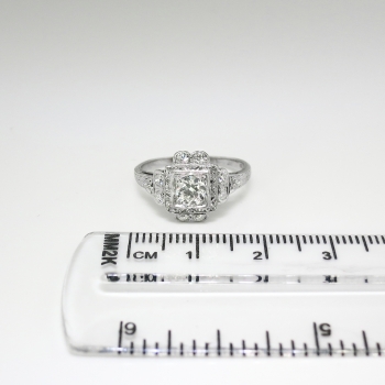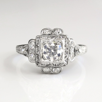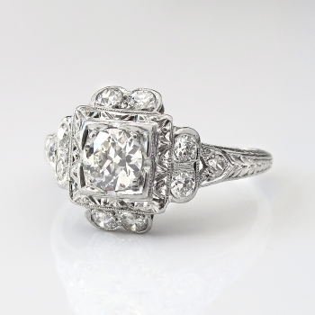 This precious heirloom engagement ring hails from the early 1930's and is waiting for one lucky lady! An original Art Deco engagement ring with a unique design and an array of incredible antique cut diamonds! The central diamond weighs approximately .36cts and has the quality grade of I color, SI1 clarity. That diamond is surrounded by 10 .03ct old European cut and single cut diamonds that are bead set with the quality range of H-I color, SI1-I1 clarity. This ring has an approximate grand total carat weight of .66ct t.w. and would make a dream 1930's engagement ring or utterly romantic anniversary ring! This ring has subtle hand engraving and the shape is really special! This ring measures 11.25mm North to South, 16mm East to West, and is raised 5mm off the finger. This ring is made entirely in platinum (stamped), weighs 3.1 grams, is currently a finger size 6.25 and my trusted jeweler can safely re-size this up or down 2 sizes free of charge and will take 1-5 business days, just ask (additional sizes up will be a flat $75.00 platinum fee, just ask!). I will be more than happy to type up a certified retail replacement insurance appraisal upon completion of sale, just ask! Questions are welcomed on Ring-1738.