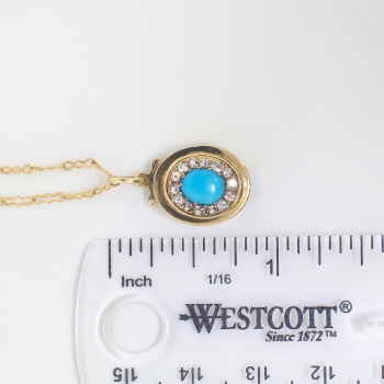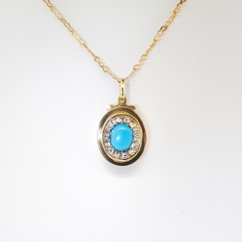 This is a special vintage 1930's pendant to wear for any occasion! This pendant features a bright cabochon turquoise that weighs approximately .52cts. That gemstone has a strong greenish-blue hue and measures 7mm x 5mm. That gemstone is adorned by a halo of glittering old mine cut diamonds that have a total carat weight of approximately .15ct t.w. and the quality range grade of I-J color, SI1-I1 clarity. The total gemstone and diamond weight for this piece is .67ct t.w.. This pendant weighs 4.9 grams of 14k yellow gold (tested and guaranteed) and is adorned on a 16" inch 14k yellow gold cable link chain. This pendant has US origin and was likely a pearl clasp before it was converted into this sweet pendant! This would make the perfect graduation gift! Layaway and questions are welcomed on Pendant-1616.