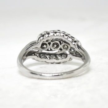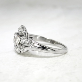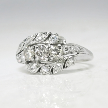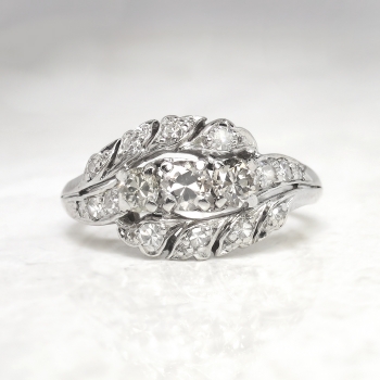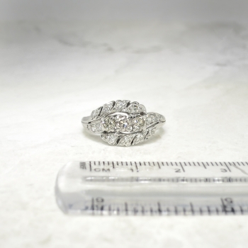 This solid platinum and diamond encrusted cocktail ring from the 1930's will transport you back in time and make you smile every time you look down, especially at this value! This ring features three old European-transitional cut diamonds set in a single row in individual four-prong mountings, flanked by six graduated single cut diamonds, between a by-pass-style mounting set with eight single cut diamonds, on a half-round shank which measures from 1.70 to 3.53 mm in width. The central diamond is graded I color, SI1 clarity and weighs approximately .22cts. That diamond is adorned by one .23ct diamond graded M color, VS2 clarity, and one .15ct N color, VS2 clarity diamond. In addition to those glittering diamonds are 14 single cut diamonds that are graded G-H in color, SI1-SI2 in clarity, weigh from approximately .01cts to .03cts each, and have an approximate total weight of .34ct t.w.. This ring has a grand total diamond weight of approximately .94ct t.w.. The ring is stamped “PLAT.” meaning platinum, weighs 8.5 grams, and is currently a finger size 6.5. My trusted jeweler can safely re-size this up to four sizes or down to two sizes free of charge, just ask! I will be more than happy to email a certified retail insurance replacement appraisal upon completion of sale, just ask! Layaway and questions are welcomed on Ring-1574.