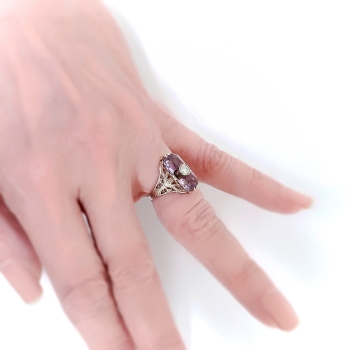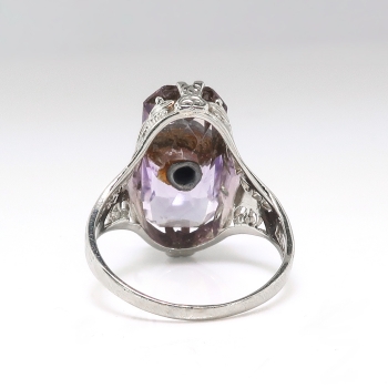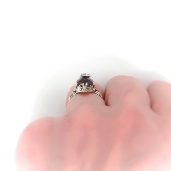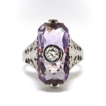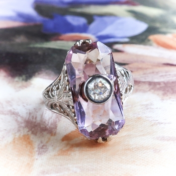 A true 1930's elegant piece of art for you! A rare and stunning 'Rose De France' hued natural amethyst with a beautiful bezel set old European cut diamond and a true Deco look! I really hit the jackpot with this one! This is a 14k white gold, amethyst quartz, and diamond ring, of hand-made construction, circa 1930’s. The ring comprises a cut-corner modified rectangular mixed cut amethyst, bezel-set at the center with one round brilliant cut diamond, prong-set within a filigree mounting measuring 16.44 mm long, on a 1.43 mm wide shank. The amethyst measures approximately 14.94 x 7.42 x 4.75 mm, and weighs approximately 3.77 carats. The diamond is VS1 in clarity, H-I in color, cut grade: good, measures approximately 3.56 mm in diameter, and weighs approximately .17 carats. The ring is stamped “BELAIS 14K”. Total weight: 2.9 grams. This ring is currently a finger size 5.5. I can have my trusted jeweler safely re-size up or down two sizes free of charge and will take 1-5 business days, just ask (additional sizes up will be a flat $45.00 gold fee, just ask!). Questions are welcomed on Ring-2229.