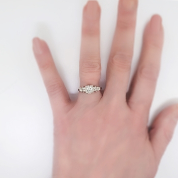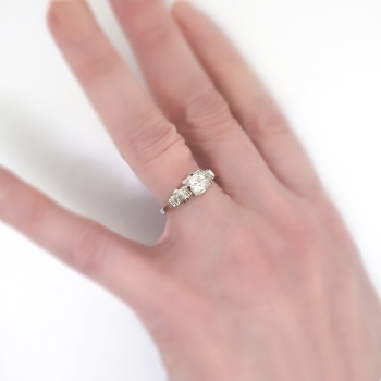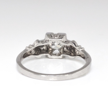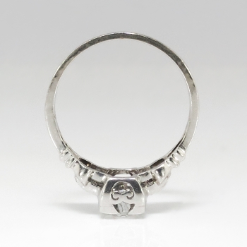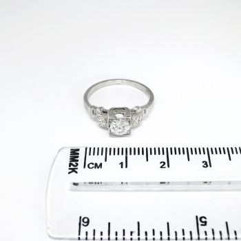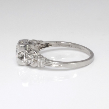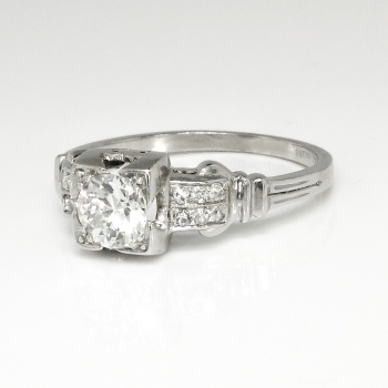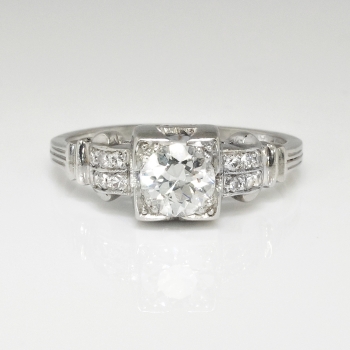 I love acquiring these special 1930's diamond and platinum engagement rings! It has a great era appropriate design and just the right amount of sparkle set in luxurious platinum! This ring is comprised of a central old European cut diamond that weighs approximately .48cts and has the quality grade of H color, SI2 clarity. That diamond is safely set in a durable box triple claw prong setting that enhances the presence of the diamond. That diamond is adorned by two double rows of 12 bead set single cut diamonds that have a grand total accent weight of .12ct t.w. and have comparable quality (H-I color, SI1-I1 clarity). This ring has a grand total carat weight of approximately .60ct t.w.. This ring measures 6.6mm North to South, 17mm East to West, and is raised 5.25mm off the hand. Any platinum wedding band would look amazing with it's clean edges and shape. The ring is stamped “10% IRID PLATINUM” which is the standard Art Deco era platinum formula. This ring weighs 3.4 grams, is currently a finger size 6.25, and Jewelry Finds® offers complimentary ring re-sizing + or - 2 sizes! The cost of additional sizing up or down will be determined on a case by case basis so please inquire :). Ring re-sizing takes an additional 1-5 business days. I will be more than happy to email this ring's current certified and guaranteed retail replacement appraisal upon completion of sale, just ask! Questions are welcomed on Ring-1628.
