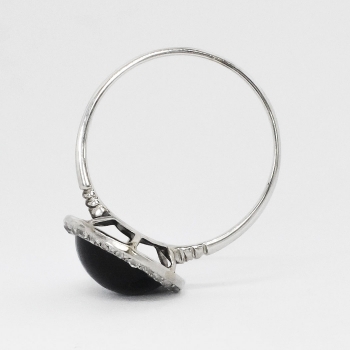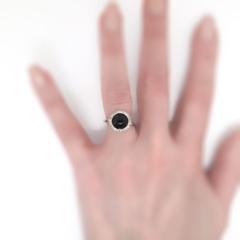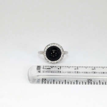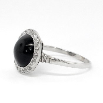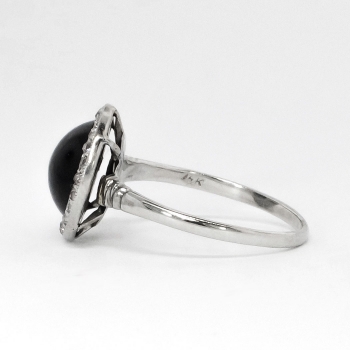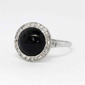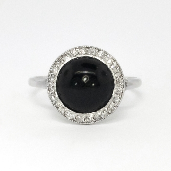 This immaculate natural black onyx and diamond ring made in bright 14k white gold was originally worn as either a sentimental mourning ring or else a fashion statement ring from the early Art Deco era. It is in pristine condition! This ring features a 11.75mm round cabochon natural onyx surrounded by tiny glittering rose cut diamonds ( .10ct t.w. H-J color SI clarity). This ring has tiny milgrain detailing and is light enough to wear everyday. This ring weighs 2.5 grams and measures 12.5mm in diameter and is raised 5.5mm off the finger. This ring is currently a finger size 6.75 and my trusted jeweler can safely re-size this up to four sizes or down two sizes, just ask! A unique piece of history with modern flair for an attainable value, only from Jewelry Finds! Questions are welcomed on Ring-1487.