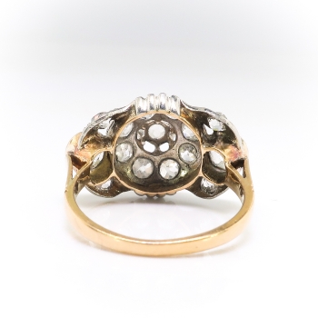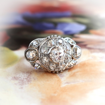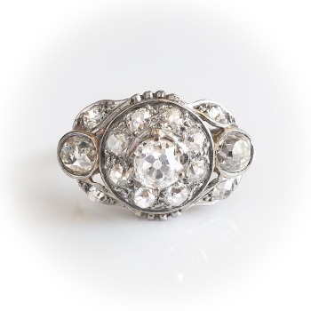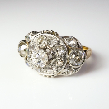 This is an antique chunky monkey ring! If you love a ton of glitter on your finger, this is the one! Don't miss out on this 18k yellow gold, platinum, and antique cut diamond ring, of hand-made construction, made sometime in the early 1920's. The ring comprises a prong-set old mine cut diamond surrounded by eight old European cut diamonds, flanked by two bezel-set old European cut diamonds, the corners of the roughly oval mounting set with four old European cut diamonds, all set in platinum, measuring 19.94mm x 12.89mm, on a half-round, 18k yellow gold shank which measures from 1.57mm to 2.20mm wide. The old mine cut diamond are SI1 in clarity, H-I in color, measures approximately 4.46mm x 4.46mm x (2.68)mm, and weigh approximately .36ct t.w.. The two flanking old European cut diamonds are both VS1 in clarity, I-J in color, measure approximately 4.37mm x 4.37mm x (2.62)mm, and weigh approximately .32cts each. The 12 smaller diamonds are VS2-SI2 in clarity, H-J in color, measure from approximately 2.82mm to 2.65mm, weigh from approximately .07cts to .09cts each, and have an approximate total weight of 1.00ct t.w.. This outstanding and sparkling diamond ring has a grand total diamond weight of approximately 2ct t.w.! The ring is unmarked, weighs 4.1 grams, and is currently a finger size 6. Jewelry Finds® additional sizing up or down will be determined on a case by case basis so please inquire :). Ring re-sizing takes an additional 3-7 business days by a third party Master Bench Jeweler, not to worry! Your ring is in good hands! I will be more than happy to email this piece's current certified and guaranteed retail replacement appraisal upon completion of sale, just ask! Installment Plans Always Available with 25% down and up to five additional months in payments! Don't let this piece get away! Questions are welcomed on Ring-2205.
