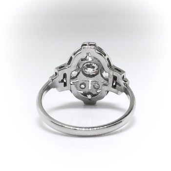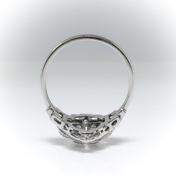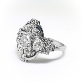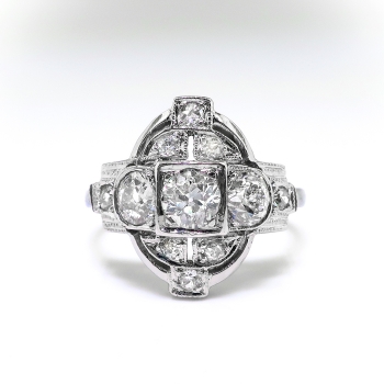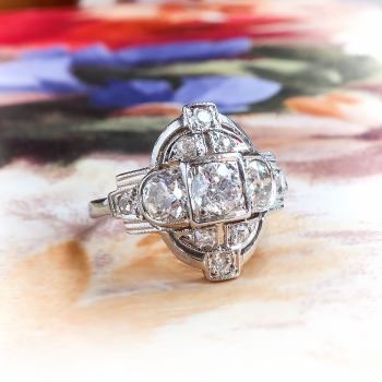 This is such a fun and sparkly Art Deco find!!! Wear this as an alternate engagement ring or stunning right hand ring as a gift to yourself! This unique Art Deco jewel comprises a plaque-style mounting bead-set throughout with eleven old European and single cut diamonds, individually set into geometric mountings forming a roughly oval outline, on a half-round shank which measures 1.72 mm in width. Three Old European cut diamonds are SI2 in clarity, H-I in color, and have the following approximate measurements and weights: 1) 4.55 x 4.55 x 2.63 mm, .35 cts; 2) 4.19 x 4.19 x 2.80 mm, .31 cts; 3) 4.05 x 4.05 x 2.30 mm, .24 cts. The eight smaller diamonds are SI1-SI2 in clarity, H-J in color, measure an approximate average of 1.90 mm in diameter, and weigh approximately .03 carats each. Approximate total gem weight: 1.14 carats. The ring weighs 3.9 grams, is unmarked and is currently a finger size 6. I can have my trusted jeweler re-size this for you, just ask! I can also email this piece's current retail replacement appraisal upon completion of sale, please inquire. Questions are welcomed on Ring-2348.