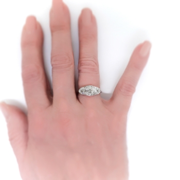 This vintage early Art Deco diamond cocktail ring is blinding! Even more beautiful is the elegant hand engraving and filigree work! An heirloom quality 18k white gold and diamond ring, of hand-made construction, circa 1920’s/30's. The ring comprises an oval mounting measuring 17.90 x 8.58 x 5.19 mm, surface-prong-set throughout with a total of twenty-nine (29) Old European cut diamonds, atop a pierced gallery, on an engraved, knife-edge shank which measures from 0.89 to 2.72 mm in width. One diamond is SI2 in clarity, H-I in color, measures approximately 4.28 x 4.28 x (2.57) mm, and weighs approximately 0.30 carat. The remaining diamonds are SI1-SI2 in clarity, H-I in color, measure from approximately 1.43 to 3.62 mm in diameter, weigh from approximately 0.01 to 0.17 carat each, and have an approximate total weight of 0.83 carat. Approximate total gem weight: 1.13 carats. The ring is stamped “18K” and is currently a size 7. Total weight: 2.8 grams. I can have my trusted jeweler re-size this for you for a flat $45 gold sizing fee, just message me prior to checking out so I can adjust the listing. I can also email this piece's current retail replacement appraisal upon completion of sale, please inquire. Questions are welcomed on Ring-2372.