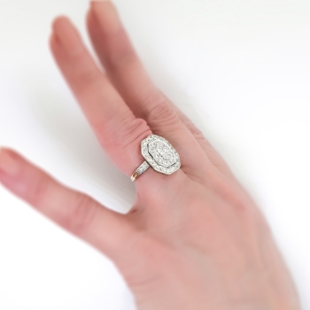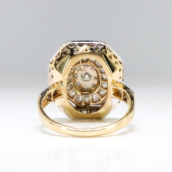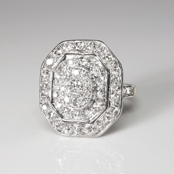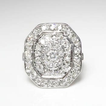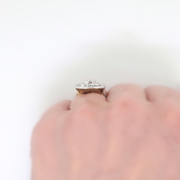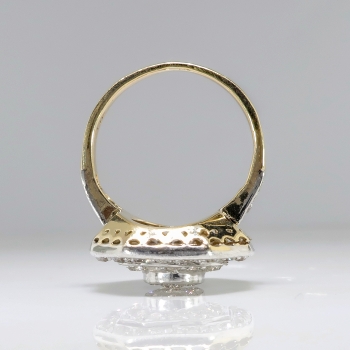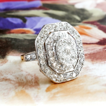 This ring is huge and sparkly! Perfect for someone who wants something impressive and vintage on a budget! A fun 1950's ring made in platinum over 14k yellow gold that measures a whopping 17.04mm North to South, 15.27mm East to West, and is raised 5mm off the finger. The ring comprises an octagonal mounting that is surface-prong-set with one round transitional brilliant cut diamond (.12cts) surrounded by a tiny halo of eight transitional brilliant cut diamonds, surrounded by ANOTHER halo of 16 old European cut diamonds, surrounded in turn by a final enormous halo of 22 old European cut diamonds. Three gorgeous halos of glittering diamonds all set in platinum atop a pierced, 14k yellow gold gallery, with four diamonds set into the shoulders of the flat, yellow gold shank, which measures from 1.41mm to 2.77mm wide. The 51 diamonds are a mixture of round brilliant and old European cut, VS1-VS2 in clarity, G-H in color, measure from approximately 1.10mm to 3.18mm in diameter, weigh from approximately .005 to .12 carats each, and this ring has an approximate grand total diamond weight of approximately 1.25ct t.w.. The ring is stamped “14K” with the top platinum (stamped 14k but all metals have been tested and guaranteed). This ring weighs 4.5 grams and is currently a finger size 4. Jewelry Finds® offers complimentary ring re-sizing + or - 2 sizes! The cost of additional sizing up or down will be determined on a case by case basis so please inquire :). Ring re-sizing takes an additional 1-5 business days. I will be more than happy to email this piece's current certified and guaranteed retail replacement appraisal upon completion of sale, just ask! Questions are welcomed on Ring-1946.