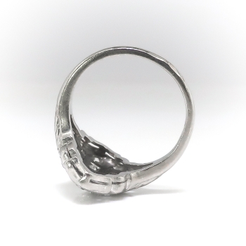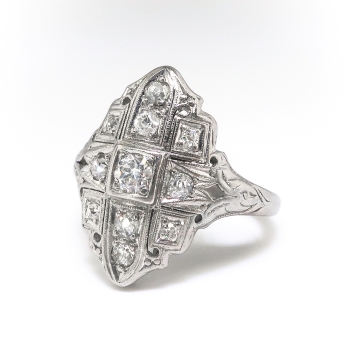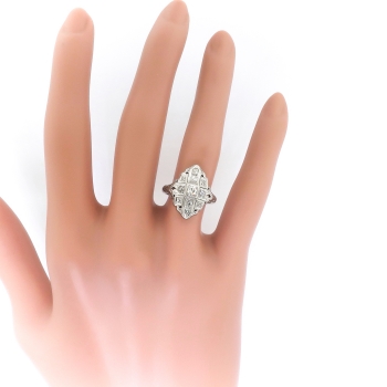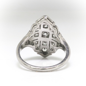 Don't miss out on this truly remarkable and geometrical glitter bomb Art Deco ring from the late 1930's in palladium- a white metal that is strong and durable like platinum and was popular in the early to mid 20th century. This is a glittering navette style diamond plaque ring, of hand-made construction, circa 1920’s. The ring comprises an oval mounting, measuring 18.17 x 15.00 x 4.23 mm, set at the center with one Old European cut diamond and bead-set throughout with 10 old European and single cut diamonds within geometric mountings, on a split shank which measures from 1.65 to 3.03 mm in width. The diamonds are SI1-SI2 in clarity [one is chipped], H-J in color, measure from approximately 1.67 to 3.27 mm in diameter, weigh from approximately 0.02 to 0.13 carat each, and have an approximate total weight of 0.49 carat. The ring weighs a nice solid 3.4 grams, is stamped 'B PALL' and tested to be palladium and is currently a finger size 4.5. I can have my trusted jeweler safely re-size this for a flat $75 palladium sizing fee, just shoot me your ring size prior to checking out. I will be more than happy to email this piece's current retail replacement appraisal upon completion of sale, just ask! Questions are welcomed on Ring-2403.