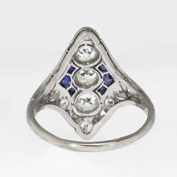 A breathtaking heirloom quality Art Deco ring in pristine condition for one lucky lady! This fantastic Circa 1930's alternate engagement ring or ANY finger ring features three central bezel set old European cut diamonds surrounded by six French calibre cut lab sapphires (era appropriate synthetic sapphires was all the rave) and an additional 12 single and old European cut diamonds in an elegant navette style ring made entirely in platinum. The ring comprises a milgrain-edged, navette-shaped mounting measuring 19.58mm x 16.16mm and is raised 4.5mm off the finger. The three central diamonds are VS1 in clarity, G-H in color, measure approximately 4.00 mm in diameter, and weigh approximately .26 carats each. The synthetic but highly convincing sapphires measure from 1.61mm x 1.02mm to 3mm x 2.14mm, weigh from .02 to .04 carats each, and have an approximate total weight of .16ct t.w.. The additional diamonds are VS1-VS2 in clarity, G-I in color, weigh from .02 to .05 carats each, and have an approximate total weight of .40ct t.w.. This ring has an approximate grand total weight of 1.34ct t.w.. The ring is stamped “PLAT” and with a maker’s mark comprising the letters “HW” within a larger, stylized “W” [Hayden W. Wheeler & Co., Inc., New York, NY]. The shank tapers from 2.75mm to 1.50mm. This ring weighs 3.7 grams, is currently a finger size 6.25 and is resizable. The cost of additional sizing up or down will be determined on a case by case basis so please inquire :). Ring re-sizing takes an additional 1-5 business days. Questions are welcomed on Ring-1416.