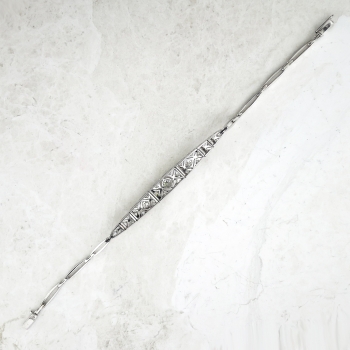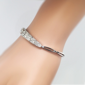 What a beautiful vintage bracelet to wear with ANYTHING! This bracelet is made entirely in 18k white gold (tested and guaranteed) with open delicate links along with a box clasp with a safety catch. This is an ideal diamond bracelet to add to your vintage jewelry collection! This elegant and glittering bracelet can be worn day to night! This bracelet weighs 10 grams and measures 6.25" inches in length (can be sized by my trusted jeweler if needed, please inquire). It is flexible and is in wonderful nearly antique condition! This bracelet features a central bezel set old European cut diamond weighing approximately .25cts that has the quality grade of I-J color, SI2 clarity. That diamond is adorned by an additional 28 old European cut and single cut diamonds that have comparable quality (I-J color, SI1-SI2 clarity) and a grand total diamond weight of .50ct t.w.. This bracelet has a grand total carat weight of .75ct t.w.. This is just the perfect understated elegant piece! I will be more than happy to email an insurance retail replacement appraisal upon completion of sale, just ask! Layaway and questions are welcomed on Bracelet-1584.