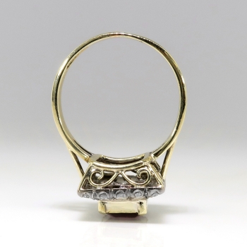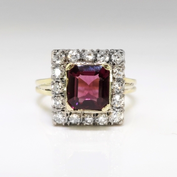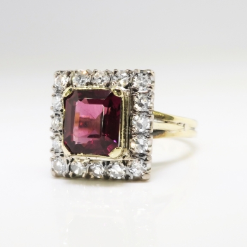 Calling all January babies, garnet lovers, and Retro era jewelry collectors!!! Do not miss out on this romantic 1940's rare rhodolite garnet ring surrounded by glittering transitional cut diamonds in a two tone filigree adorned setting! It's a great size, not too big, not too small. You will love it and the best part is no one else will have it! The color is a purplish-red and is absolutely breathtaking! This ring features a rare square emerald cut rhodolite garnet set in four yellow gold prongs, surrounded by sixteen transitional-single cut diamonds prong-set within a square white gold mounting measuring 13.14mm x 12.71mm, atop a scrollwork gallery, on a yellow gold split shank which measures from 2.16mm to 3.87mm wide. The garnet is eye clean, color: P2R80/30% Black Mask, measures approximately 7.25mm x 6.68mm x 4.06mm, and weighs approximately 1.74cts. The bezel makes it look much larger though and enhances the gem's color! The adorning prong set diamonds are VS1-VS2 in clarity, E-F in color, measure an approximate average of 2.20mm in diameter, and weigh approximately .04 carats each. This beautiful ring has a grand total gemstone and diamond weight of approximately 2.38ct t.w.. This ring is stamped 'HK14K' with an illegible 'M' and is tested entirely and guaranteed 14k yellow and white gold. This ring weighs 4.9 grams, is currently a finger size 8, and my trusted jeweler can safely re-size this up or down two sizes free of charge and it will take an additional 1-5 business days, just ask (additional sizes up or down will be a flat $45.00 gold fee, just ask!). This ring measures 13.15mm North to South, 12.75mm East to West, and is raised regally 8mm off the finger. I will be more than happy to email a current certified and guaranteed retail replacement appraisal upon completion of sale, just ask! Questions are welcomed on this beautiful and unique garnet ring, Ring-1911.