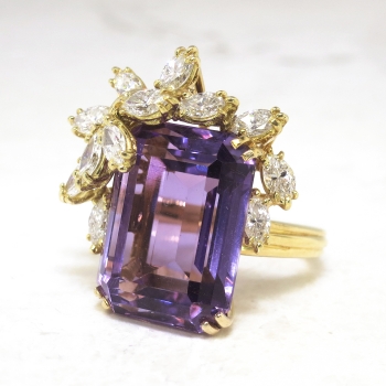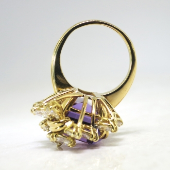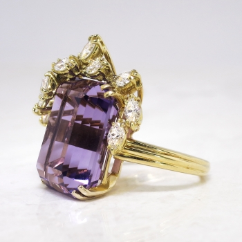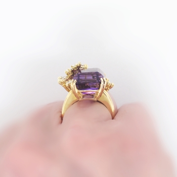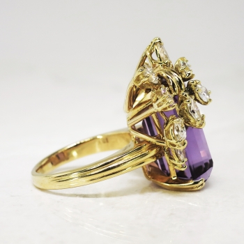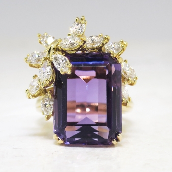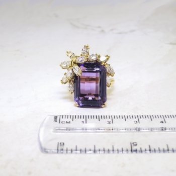 This may be one of the most beautiful rings I have ever set eyes on. I truly don't even need to gush over how spectacular this ring is; just watch the YouTube video! It is like a bright purple present with a glittering bow! Or diamond encrusted wisteria branches enveloping holding that marvelous gem. A heirloom piece for sure! This ring features a central large, natural and GORGEOUS emerald cut amethyst weighing approximately 15.13cts that is safely prong set. That gemstone is adorned by two carats of chunky and sparkly marquise cut diamonds that have the quality range of G color, VS1 clarity. This ring has an outstanding grand total gemstone and diamond weight of 17.13ct t.w.! This ring measures an impressive 25mm North to South, 22.5mm East to West, and is raised 11mm off the finger. This ring is made in 18k yellow gold (stamped), weighs 14.10 grams, and is currently a finger size 6.5. My trusted jeweler can safely re-size this up or down two sizes free of charge, just ask! I can also have this ring sized up to any size for additional charge of a flat $45.00 gold fee, just ask! Layaway and questions are welcomed on Ring-1585.