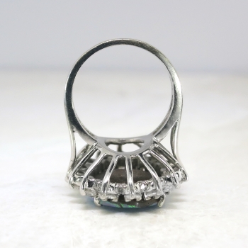 This is a fun vintage cocktail ring with a desirable gemstone and a glittering diamond halo! It's as if you are wearing a diamond encrusted planet on your finger! This is a large and beautiful bauble from the early 1970's with a timeless 'Princess Di' design and setting of 18k white gold (stamped and guaranteed). The natural brown boulder opal measures 17mm x 13.50mm and weighs approximately 6.44cts. Surrounding that bright blue-green and fiery gemstone are 16 prong set diamonds (1.03ct t.w.) with the quality range of H color, SI1-SI2 clarity. This ring has an impressive grand total carat weight of approximately 7.47ct t.w.. This ring measures 24mm North to South, 21mm East to West, and is raised regally off the finger 9mm tall. This ring weighs 8.4 grams and is currently a finger size 6.5. My trusted jeweler can safely re-size this up or down two sizes free of charge, just ask ( re-sizing up additional sizes is a flat gold fee of $45.00, just ask!). This will be a colorful and valuable addition to any collection! Layaway and questions are welcomed on Ring-1590.