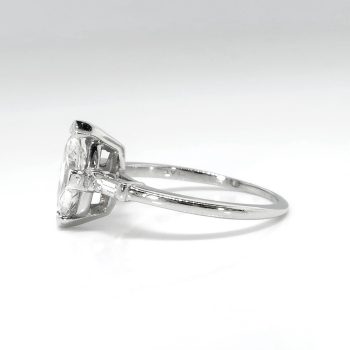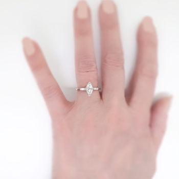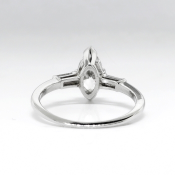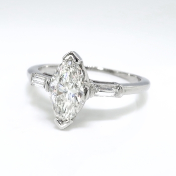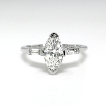 This delicate and original 1970's marquise engagement or anniversary ring can sparkle across a room! This tested and guaranteed platinum (stamped) marquise and baguette diamond three stone engagement ring measures 14.00mm East to West, 10.60mm North to South, and is raised off the finger 5.80mm. The central prong set marquise shaped cut diamond, measuring 9.32mm x 5.16mm x 3. 17mm weighs approximately .85cts and has the quality grade of I color, VS2 clarity. A sparkling and beautiful cut! That diamond is adorned by two baguette bar set diamonds measuring 3.00mm x 1.50mm x 1.28mm (depth est.), having the quality grade range of G-H color, VVS2-VS1 clarity, and an approximate total weight being .11ct t.w.. This ring has an approximate grand total diamond weight being .96ct t.w.. This ring weighs 3.5 grams, is currently a finger size 5.5 and Jewelry Finds® additional sizing up or down will be determined on a case by case basis so please inquire :). Ring re-sizing takes an additional 3-7 business days by a third party Master Bench Jeweler, not to worry! Your ring is in good hands! I will be more than happy to email this piece's current certified and guaranteed retail replacement appraisal upon completion of sale, just ask! Questions are welcomed on Ring-1910.