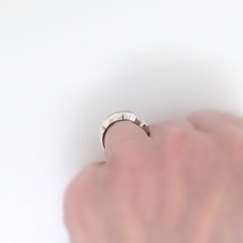 This swirling and sparkling 1940's bead set geometrical five stone diamond wedding/stacking band looks great on it's own, or stack it with gemstone bands, your vintage engagement ring or wide gold rings for an impressive look. The ring features three .05ct round brilliant cut diamonds and two .03ct round brilliant cut diamonds with the quality rage of H color, SI1 clarity with a grand total carat weight being .21ct t.w.. This ring measures 4.5mm North to South, 19.63mm East to West, and is raised 3mm off the finger. This ring is made in platinum (stamped 10% IRID.PLAT), weighs 3.9 grams, is currently a finger size 6.25. I can have my trusted jeweler safely re-size this up or down two sizes free of charge, just ask (additional sizes up will be a flat $75.00 platinum fee and takes 1-5 business days, just ask!). Questions are welcomed on Ring-1799.