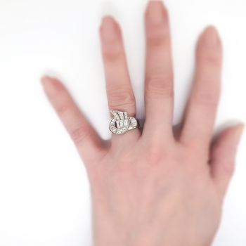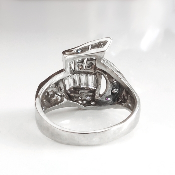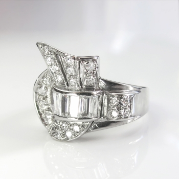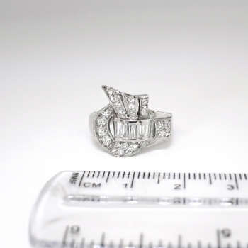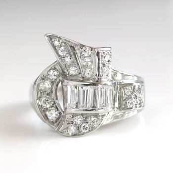 This is a true 1950's 'fan' diamond spray ring with a ton of glitz and sparkle! This ring will look great on any finger and will jazz up any outfit for any occasion! This spectacular Retro era ring has size tapered baguette diamonds graded G-H color, VVS2-VS1 clarity, and total approximately .50ct t.w.. There are also 21 adorning bead set single cut diamonds graded G-H color, VS1-VS2 clarity, and have a combined diamond weight being .50ct t.w.. This ring has an approximate grand total carat weight of 1ct t.w.. This ring measures 15mm North to South, 16mm East to West, and is raised 3mm off the finger. This ring is made entirely in 14k white gold (stamped), weighs 4.2 grams, and is currently a finger size 6.5. I can have my trusted jeweler safely re-size this to any size for a flat $45.00 gold fee and will take 1-5 business days, just ask! I will be more than happy to email this ring's independent unbiased certified retail replacement appraisal in the amount of a whopping $4,000.00 upon completion of sale, just ask! Questions are welcomed on Ring-1686.